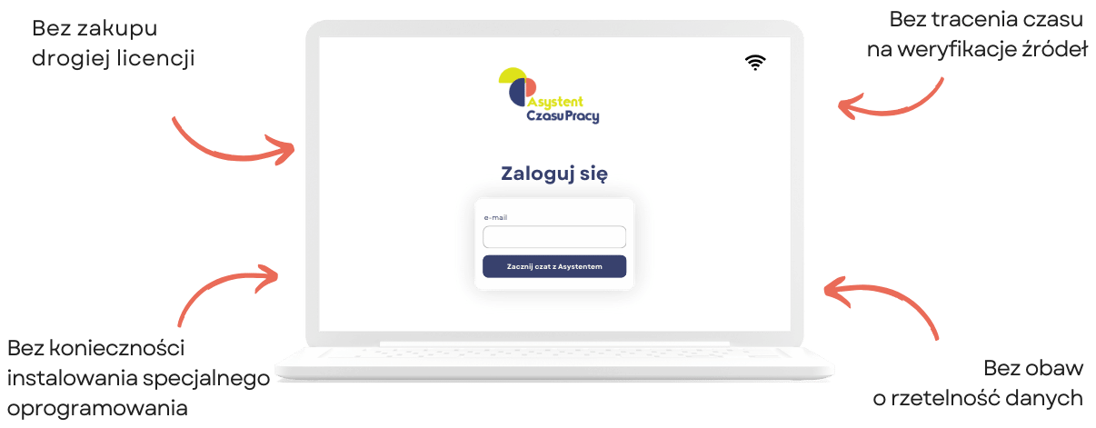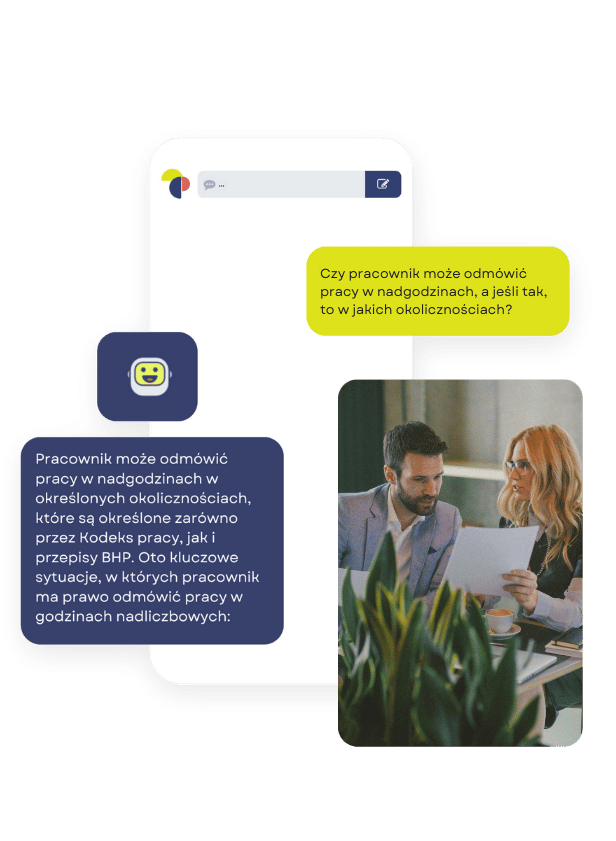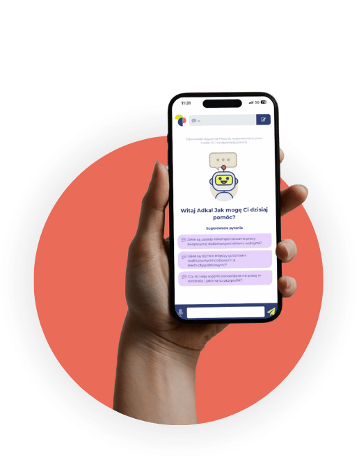 Asystent Czasu Pracy to Twój osobisty chatbot, który odpowiada w czasie rzeczywistym na wszystkie pytania i wątpliwości związane z czasem pracy. Ułatwi Ci podjąć kluczowe decyzje dotyczące planowania, ewidencji i rozliczania czasu pracy oraz odciąży Cię od konieczności odpowiadania na powtarzalne pytania współpracowników.